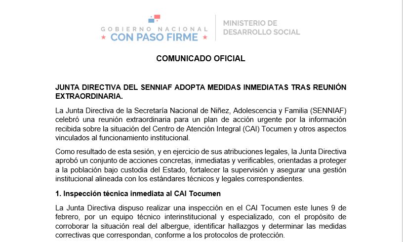 La Junta Directiva dispuso realizar una inspección en el CAI Tocumen este lunes 9 de febrero, por un equipo técnico interinstitucional y especializado, con el propósito de corroborar la situación real del albergue, identificar hallazgos y determinar las medidas correctivas que correspondan, conforme a los protocolos de protección.